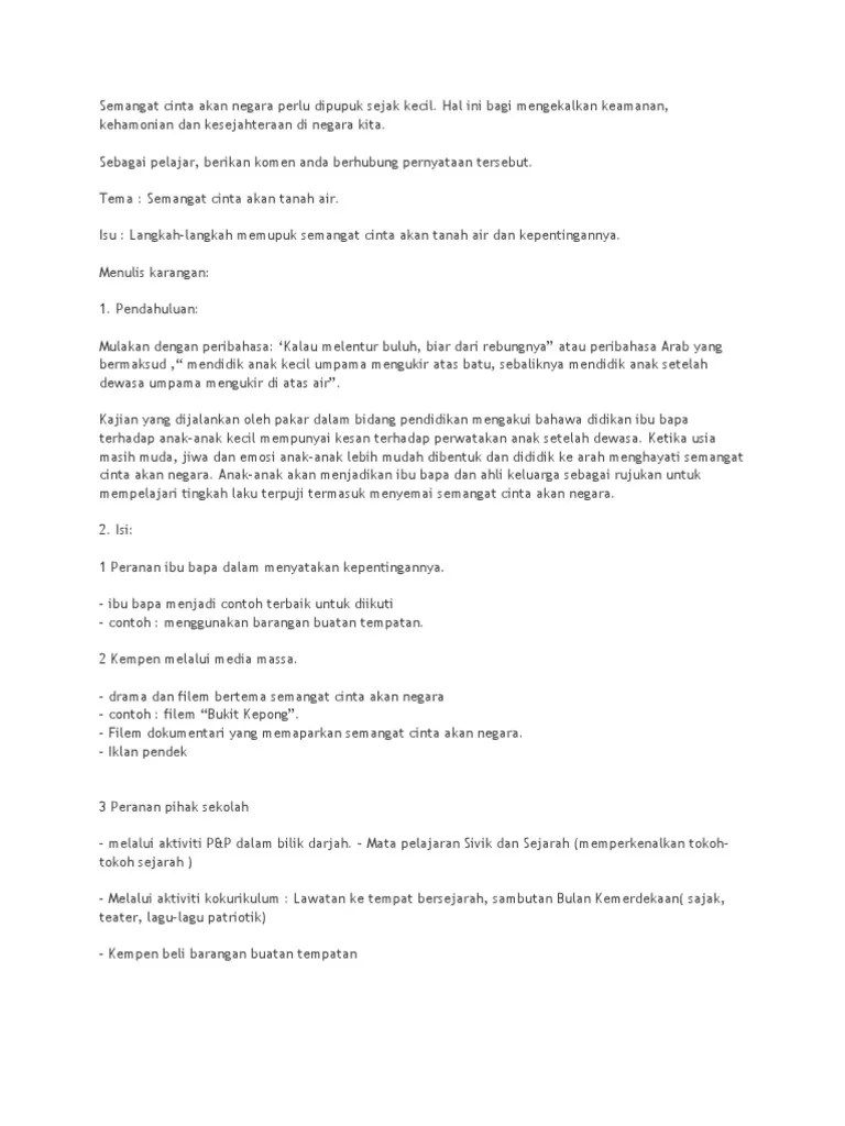 Oleh karena itu, rasa cinta tanah air perlu ditumbuh kembangkan dalam jiwa setiap individu sejak usia dini yang menjadi warga negara . Cinta tanah air adalah cara berpikir, bersikap, dan berbuat yang menunjukkan. Semangat ini mampu mempengaruhi masyarakat untuk mengutamakan kepentingan negara berbanding . Bangga menggunakan produk buatan negara sendiri merupakan salah satu cara yang dapat kita lakukan untuk menunjukkan rasa cinta kita terhadap tanah air . Indonesia dan memiliki rasa cinta pada bangsa dan negara.